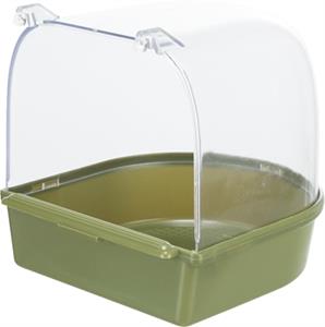 Het halfronde badje gemaakt van kunststof en om in de deuropening van de kooi te hangen.  Wordt geleverd in een willekeurige kleur Optimale deuropening: 13 × 10 cm Afmeting: 14 x 14 x 15 cm   Merk Trixie   Het badje waar uw vogel lekker in kan badderen